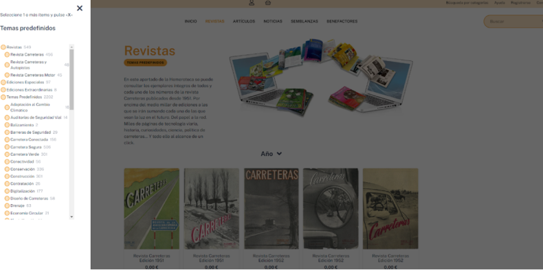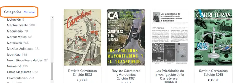 - Otros: Son gratuitas las descargas de las ediciones ordinarias de la revista Carreteras. Las ediciones especiales, las extraordinarias y los artículos tienen un coste asociado.